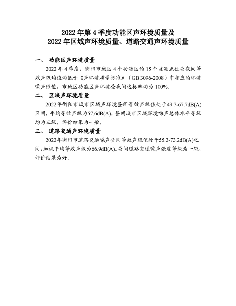 2022年第4季度功能區(qū)聲環(huán)境質(zhì)量及2022年區(qū)域聲環(huán)境質(zhì)量、道路交通聲環(huán)境質(zhì)量