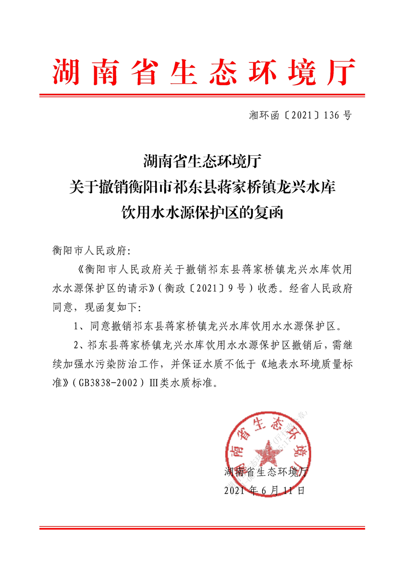 關于撤銷衡陽市祁東縣蔣家橋鎮(zhèn)龍興水庫飲用水水源保護區(qū)的復函