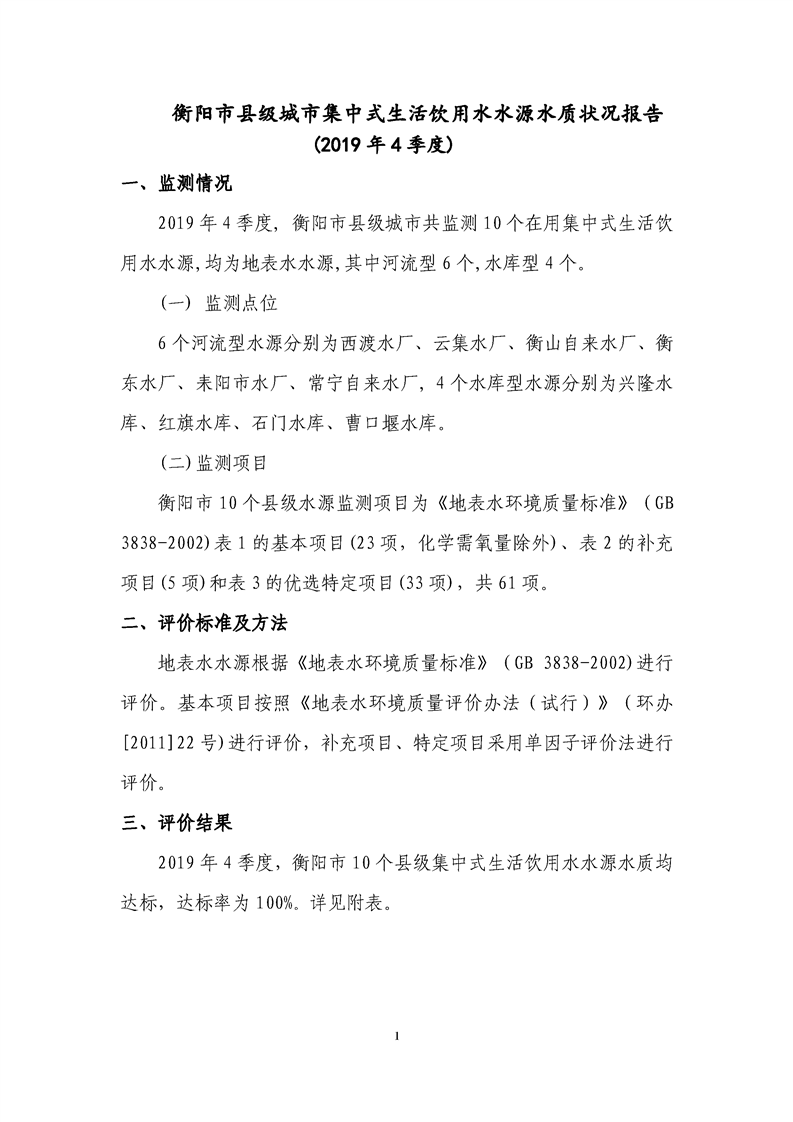 衡陽市縣級城市集中式生活飲用水水源水質(zhì)狀況報告(2019年4季度)